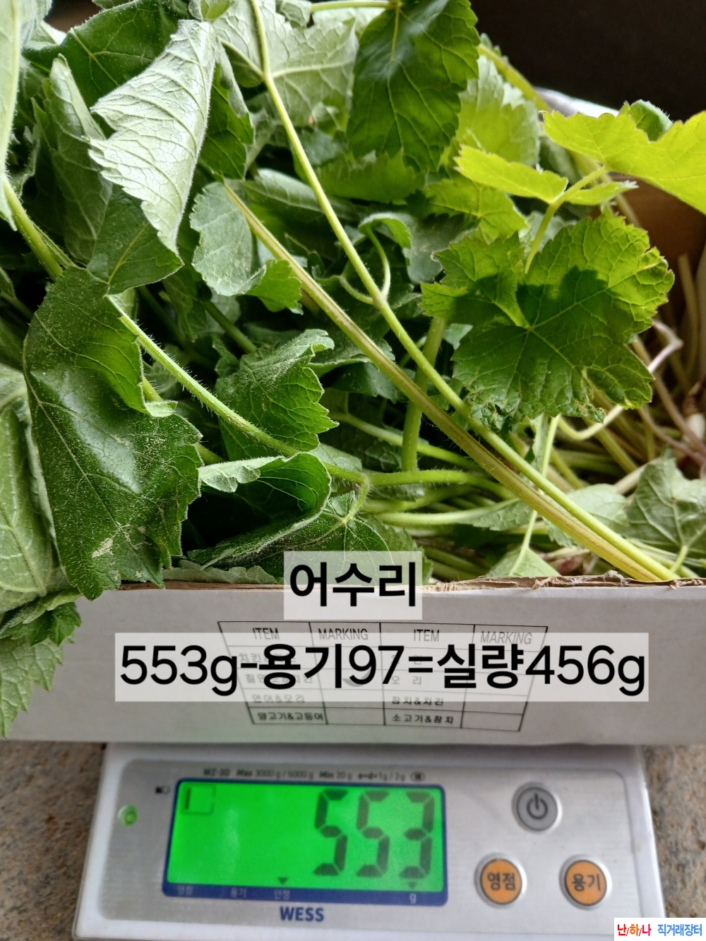 2. 어수리 계량: 553g - 용기97g = 실량456g