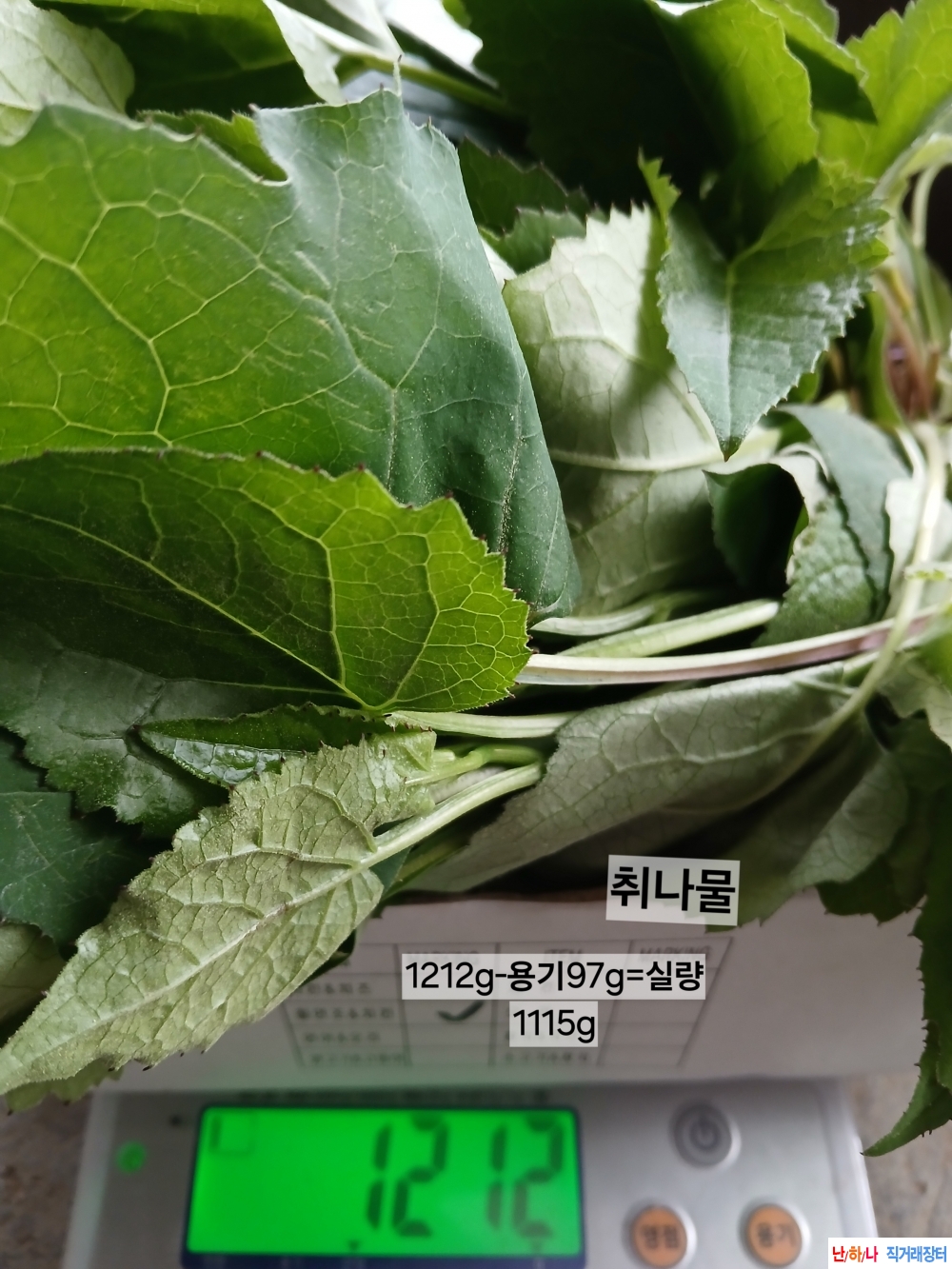 1. 취나물 계량: 1212g - 용기97g = 실량1115g