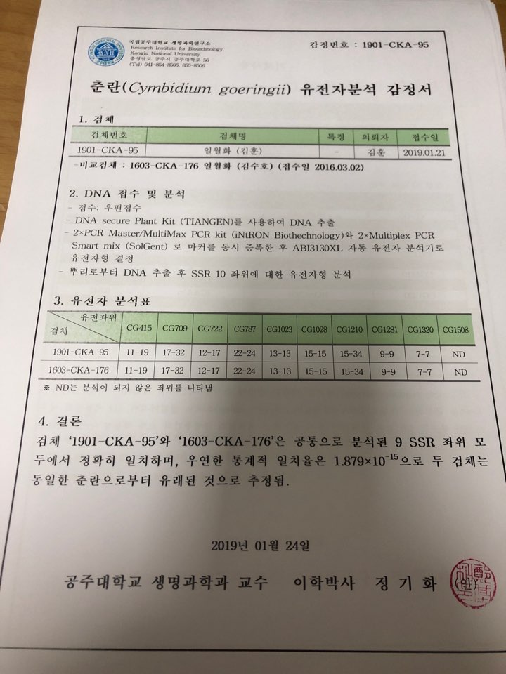 대한민국 대표 춘란 두화소심 일월화 종자목 전진1촉입니다. 작년 18년 전진촉이며, 5잎장에 중상작 입니다. 잎길이 약 12.5센치, 잎 너비 약 1.1 센치 정도이며, 잠아 튼실하게 달려있습니다. 이번에 유전자 검사완료하여 검사증 첨부합니다. 종류 : 일월화 가격 : 문의 촉수 : 1촉 연락처 : 010-6274-1154